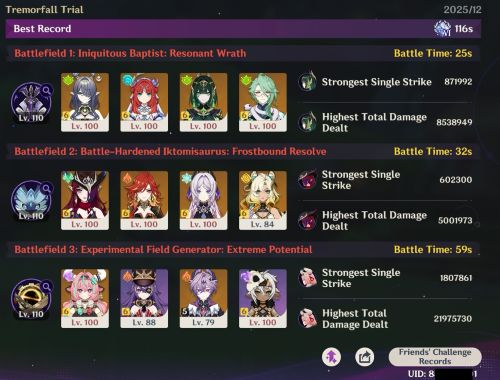 とりあえず数日経過して幽境は今こんな感じ。まだ最初の戦略をマイナーチェンジしてタイム伸ばしてる段階。もっと全然違う戦略とったら一気に伸びる可能性もあるけどそっちは追々。 初日のやつから、 1個目:27s→25s 2個目:40s→32s 3個目:79s→59s になったね。1, 2番目はメンバーは変わらず何回か挑んだりスキルの打ち方変えただけ。一番下のやつは旅人をドゥリンに入れ替えた感じ。ドゥリンは過負荷へのバフのためスキル通常爆発じゃなくてスキルスキル爆発にしてる。旅人でも65秒くらいにはなってたから、なかなか旅人を超えられなくてな。見てのとおりドゥリンはレベルが低いからまだ伸びしろありだね。 この一番下の編成出す順番で全然火力が変わってくるのよな。 シュブルーズは割と自由だけど、回復すると出してるキャラの火力が上がるからそれが間に合う必要はあり、ドゥリンの爆発も継続時間中にヴァレサと過負荷起こさないといけないから打った後早めにヴァレサに回したい。イアンサも爆発後移動しないと火力維持できない&持続時間があるからなるべく早くヴァレサに回したい。というみんながみんなさっさとヴァレサにバトンつなぎたいキャラで編成されております。 ついでにドゥリンのオルタービジュ開放する奴終わった。オルタービジュつったらこれ12Pカラーぐらいほぼ原種だから、ただアクセサリー付けられるよくらいか。 なげーんだこれが。ほとんどのイベント別ゲーしながら自動テキスト送りで流してた。ラジオみたいな感じで。 話半分だったせいで全くストーリー覚えてないけど、まいいか。 ついでに、の理由はこれイベント期間中にクリアしたら突破素材もらえるからなんよな。今は樹脂を幽境に使いたいからボス行く回数減らせるこのイベントは素晴らしい。 PR Comments