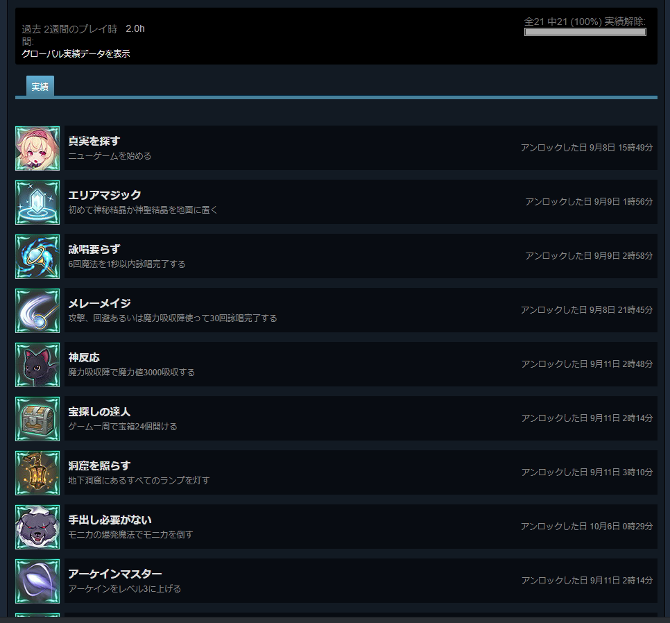ぽい。前記事で体当たりのほうが強くねっていうことを書いてた時の奴の動画化。 https://drive.google.com/file/d/1H690L6hsbKf1z-SQbSTJN0JX_kpsUON-/view?usp=sharing ここは炎をためた状態の杖でたたいて壊してねというチュートリアルなんだけど2周目特権。溜めなくていいしこっちのほうが早い。 しかしウインドのレベル2だっけ?があればあら不思議。これよくできてんのが1周目のこのクリスタルの位置の直前でウインドがレベル2になるんよね。 でもこれなんと隠しダンジョン入場用のクリスタルもステータスに関係なく壊せてしまう。上の動画だと杖叩きで補助してるけど、杖なしでも、 https://drive.google.com/file/d/10Ie2KjVcIOpYlug-4iAVYnsGIpvMVE3O/view?usp=sharing こんな感じ?普段杖殴りを空ダでキャンセルしてるせいで慣れない操作にもたもたしてるけどできることはわかるはず。このクリスタルが実際その隠しダンジョン入場用の奴。 なんでこれに攻撃判定付けようと思ったんだろう。 そういえば見えてる実績は全部とれた。これで19/21。結局チュートリアルステージの4、5匹雑魚が群れてる場所で詠唱アイスを使ってやった。さて残りの実績はどこだろう。 てことで忘れないように攻略サイト見た。 ・自分の魔法で死亡 ・モニカの爆発魔法でモニカを倒す なんだ・・・自分かボスかの違いだけで自滅系ばっかりじゃないか。Standard難易度でサクッと取りに行くかね。モニカ前のデータないから最初からかな。一個目は今のデータでも取れそうな気はする。 という記事を書いてたら我慢できなくなって取りに行ってしまった。無事実績コンプした。 モニカ自爆させるやつとか取得率8%もあってびっくりした。自滅に関しちゃ19%。みんなよくやるね。隠しじゃない滞空魔法のほうが取得率低いやん。 お疲れ様。 2021.10.07 Thu 10:07:00