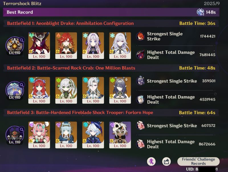 10月の幻想シアター1日か2日にやってたけど忘れてた。 今回は雷、地、水。この後実装されるフリンズ接待も兼ねた構成なんだろうね。引く前にやったからフリンズいないけど。改めてやり直してみてもいいかもしれない。 そして今回からアルカナが追加になった。これは特にうれしい効果とかはなくてコレクションだけかな? 2ステージ分追加になってるけど、もらえるカードは1枚。選択肢が与えられるだけだから初回の今回は別にどれもらっても初めてだし1ステージだけクリアでも問題ないんじゃないかな。プライドが許すかはさておき。 中盤は全然フラワー足りなかったけど後半は余ってたね。 こういうランダムピックのステージにおいて雷は層がだいぶ厚くなったなぁ。頼れるキャラが複数いるのうれしい。 全体の難易度的にはそこまででもなかった印象。ただ今回はアルカナの追加ステージがあったからその分キャラを用意しないといけないっていう難しさはあるね。どのくらいの難易度かやるまでわからなかったしね。 あとは最後に飛竜のボスが控えてるのを把握して倒せるキャラを残すようにするくらい? 各ステージの編成はこんな感じ。 今回中盤が難儀したなぁ。アルカナをだいぶ早い段階でやっちゃってキャラ足りなくなってたからね。 ボスにどうしても出したいってわけでもなく難易度高い雑魚に気軽に切っていける、けどちゃんと殲滅力ある雷電とかセノとかクロリンデの存在がまじでありがたい。Act10の飛竜はフリーナさえいれば何とでもなるやろと思って油断してた。実際そのとおりだったけど。 こうやってキャラ並べてみると水が厳しいなぁ。ヌヴィとフリーナ、夜蘭くらいしか頼れるキャラがいない。あとは補助とか回復がメインって感じでね。開花なくてもニィロウが火力枠で選択肢に挙がるくらいには層が薄い。行秋とか重宝してるけど火力枠として頼りになるかというと少なくともうちの行秋の練度では厳しい。確かムアラニとかニィロウとかもちゃんとキャラプールとしては選んでたはずだけど引く前に終わっちまったのよな。あとお兄様も。 アイノはこの時まだ全然育ってなかったけど今はそれなりに火力出るようになってるから☆4の水火力枠としては結構期待してる。 後日フリンズ使って幻想シアターとか幽境とかにも行ってみたけど・・・ 雷共鳴でのフリンズめちゃ使いやすいっすね。セノと同じくチャージ効率そんなに盛れてないのを共鳴でごまかせるのがでかい。これは幻想シアターでも活躍間違いなしだよ。探索でも使いやすい。ただインファイトとするキャラとしても打たれ弱い(アーマー/鋼体がない)からシールド欲しくなるけど。雷&月共鳴を作る意味でもシールドって意味でもイネファと組ませるのはシンプルにいい感じ。 スキル打って特殊爆発で追撃していくのはヴァレサと似てるけど編成気にせず戦えるヴァレサと月感電判定を一人で扱えるフリンズとすみ分けもばっちり。どっちも強い。 幽境・・・3番目のやつ感電するより凍結でごり押した方がタイム良いのね。 なんか知らんけど30秒くらいタイム縮まった。3番目のボスにフリンズを試したくて遊びに来たんだけどね。思わぬ収穫だった。 2番目も開花編成じゃなくてギミックをラウマに丸投げして火力押し付けたほうが強いかもしれないけど、せっかくの開花接待だからこのままにしておくよ。二度とこないだろうし。 PR 2025.10.05 Sun 10:05:00