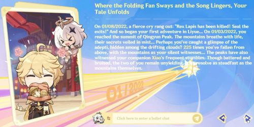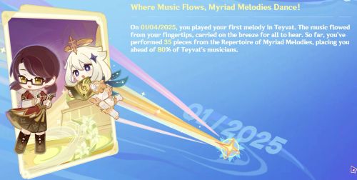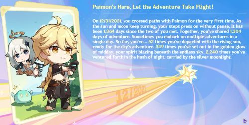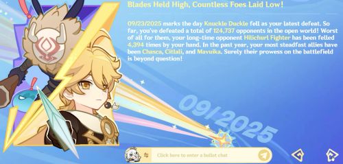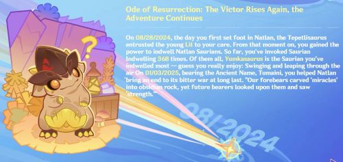 ブラウザで見れるこの1年の歩み・・・かと思いきや、今回は5年分の原神自体の振り返りと自分の記録が織り交ぜられた良質な振り返りだった。 みんな見れる奴は多分共通だろうから置いておいて、自分の記録が見れる奴適当に抜粋しておいておく。 まず最初は自分が開始した日それから、何日経ったかと何日インしたかといった情報がまとまったところからスタート。 2021年12月31日に開始だね。 続いてアチーブメント。今はもうちょい増えてるけど集計時点(9/23だか24)で1365らしい。旅人の99%より早いペースだよって書いてあるけど、これ単純に今持ってるアチブの数かな?それとも本当に数/開始からの日数とかで早さ加味してんのかな。 続いてモンドでの活動 日々の冒険者協会からの任務の話。 どのキャラが一番頼りになってますかという質問の回答欄。各国別にまとまってるんだけど、その他って誰になってんのかなと思ったらこんな感じだった。ナドクライの人たちはわかるけど執行官とかもここに入ってるね。 ここで螺旋がお目見え。最初に挑んだのは1/3らしい。初めて3日くらいで螺旋の島到達してたんだ。なかなか濃いスタートダッシュ切ってるね。 最近使ってないキャラばっかりだけど、ここにニィロウ、鍾離、ナヒーダが見えてるのなかなか熱いね。絶対開花と鍾離は同じ編成に入れないから、違う編成だけどニィロウの使用率とナヒーダの使用率の間に鍾離が入ってきてるってことよな。なかなかきわどいラインだね。 次はリーユェ。なんで飛び降りた数数えてんの。 リーユェといったら壺だね。木を集めた数とか家具作った数とかが書かれてる。 1日にあけた宝箱の数。 稲妻。 七星召喚。全然やってないんだけどそれでも旅人の90%よりやってるらしい。ほんとに触ってないって人も多いんだろうな。 ここでフレンド関係が入るんだけどちょっと記事が長くなってきたのでここまでとしてまた次回。 2025.09.29 Mon 09:29:00