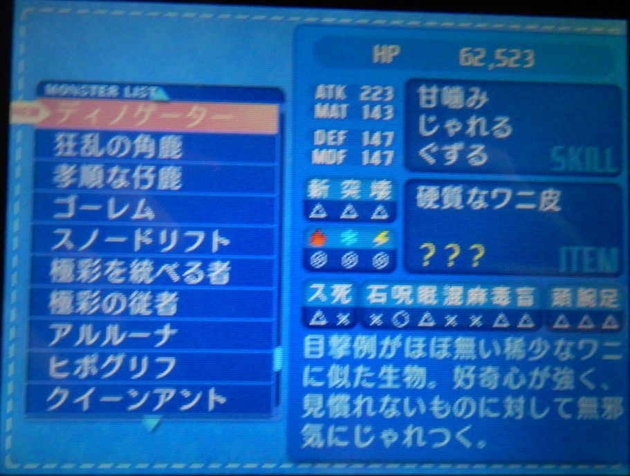 開放されたウロボロスさんも倒せました。 これについては語ることがあんまりないです。 ある程度の耐久と弱体耐性(攻撃力低下を食らっても復帰できる要素を持ってること)があればいつかは勝てるでしょう。最初負けたのは深淵の令嬢用のあまりに攻撃特化過ぎるPTでそのくせアイテム持ち込みが糸のみとか言うピーキーすぎる状況だったせいで弱体食らったらなんもできなかったせいですね。さすがに舐めてました。 さーてお次はディノゲーターさんだ。これどうすっかな・・・。 実はもうモンスター図鑑もアイテム図鑑もあとディノゲーターだけなんすよね。 出し方の条件はさっぱりわかりませんが、少なくとも奈落の霊堂を歩いている必要はないと思います。だって最後俺果樹園歩いてて出てきたらいましたもんね。他の採集ポイントにFOEがやってくるくらいまで粘ればそのうち出るでしょう。 出す方はいいんですよ出す方は。問題はどうやって倒すか・・・ 2018.08.31 Fri 08:31:00