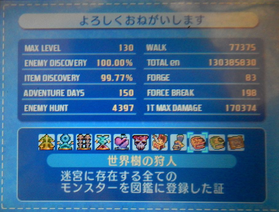 図鑑も埋まったしってことで攻略情報をいろいろあさり始めたんすよ。 そしたらなんと闇の眷属なる情報があるじゃないっすか。 こりゃあすげえってことで試してみることに。 で、いくつか調べてみたところポイント制だろうということだったので、うちの場合どうなんやろってやってみました。 というのもギルドカードなんか登録してないんすよ。 某ゲーム内のレベル13のやつと自分の奴だけ。 ってことで赤目になってるギルドカードの奴登録だけしてみたら・・・解放されました。 自分のも含めてギルドカード3枚っすよ。ちなみに難易度はエキスパ。ヒロイックじゃないです。 プレイ時間は120時間超ですね。 ほかに条件と目されているものは・・・19職作成。これは満たしてます。19職現存もしてる。 現存してるかどうかも大事だったりするのかな。 プレイ時間のポイントがでかい説には同意ですかね。これ細かい条件分かってなさそうな時点で必須とされてたギルドカード100枚なんて到底及ばない数しかないし。自分のQR出力もしてない。奈落には入ったしクリアもした。ヒロイックはプレイすらしてない。そんなとこですかね。 そのうち攻略本で正確な情報がわかることでしょう。 PR 2018.09.02 Sun 09:02:00