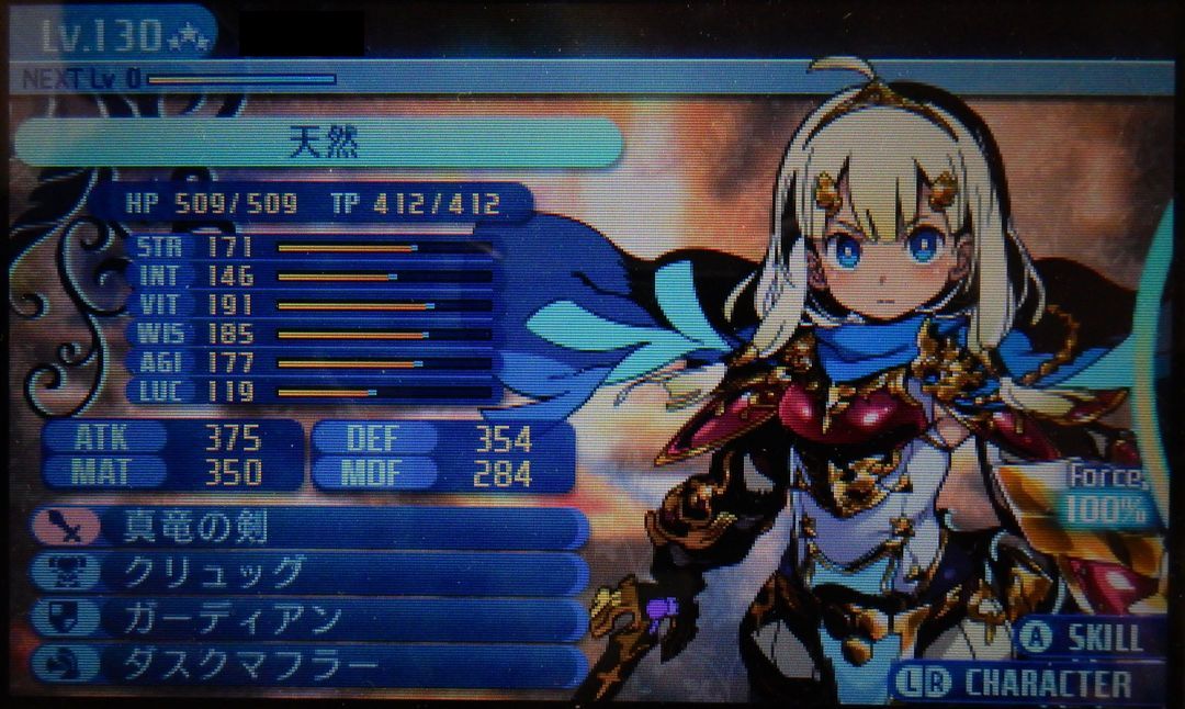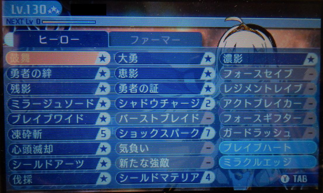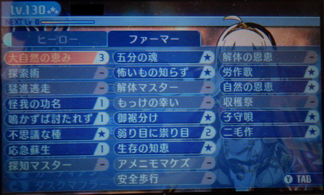 レベル99で引退した主要キャラ5人のレベル130 無事3竜倒して130までキャップが解放されたので1キャラずつ公開します。 いってなかった気もしますが難易度はエキスパートです。初見で一番上は怖かったんです。 普段使ってる並び順で行きますか。 まずはヒーロー。 こんな感じです。このキャラは最初からかっちりとやらせることが決まっててサブも一度も変えずにファーマーのみです。養殖アピールのせいで見えてないけど。使いやすいっすよ。 スキルはこんな感じ。ただレベル99の頃は攻撃スキルほとんどマスターまで振ってなかったので、あんまり振り方の参考にはならないと思います。130だからこそのこのSPの配分ってことで。 99の頃振ってなくて130になって使い始めたスキルでお勧めは凍砕斬です。火力えげつない。ゾディアックぬいたから属性攻撃が必要だっただけなんすけどね。思った以上に便利です。炎属性がないのが厳しい。炎しか通らない敵ってのはこの辺にはいないんでいいっすけどね。 ファーマーはこう。 ちなみにお裾分けは消費TPの半分を同じ列のほかのキャラが回復します。ので・・・レベル4だと消費22回復11です。これが地味にハイランダーの継戦能力あげてくれるので便利。 雑魚相手だと一緒に殴った方が早いことも多いので場面を選びますが。 最終スキルでTPがっつり回復するので生存の知恵は探索PTならお勧め。 ヒーローは専用防具の素材まだ持ってないので装備に改善の余地ありですかね。 今必死にボスのレア素材集めて回ってるのでそのうち行き当たるでしょう。図鑑の後ろからやってるので前半にあったらちょっとあれですが。 2018.08.15 Wed 08:15:00