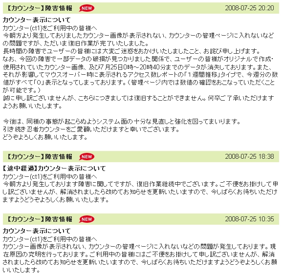 さっき追記書いたばっかだけど 判明したこととかあって新しく記事書きますw むしろさっき書いた前日の日記の追記分の方がないよう濃そうな気がするけど・・・w まぁいいでしょうw愛嬌ですよすべては(ありえないけど てことで時間もないから早速。 カウンターに関することについて書いてあったんで・・・w いろいろ言う前にちゃんと見とけって話ですよねwwwwwwww まぁ全体で起こってることとはオモわなかったってことで勘弁してちょw てことで本文コピーしたらなんか検索とかに引っかかりそうだから画像で。 ↓↓↓↓↓↓↓↓↓↓↓↓↓↓↓↓↓↓ 癖でjpgにしてしまったけど読めるかな?(確認してない まぁ記事更新してから確認しまさぁw(読めなくても多分1日放置wwwwwwwwwww ってことで25日前後で何かが起きたって結論でFA。 んじゃ今度こそオヤスミ~(寝れるわけがないけどね PR Comments