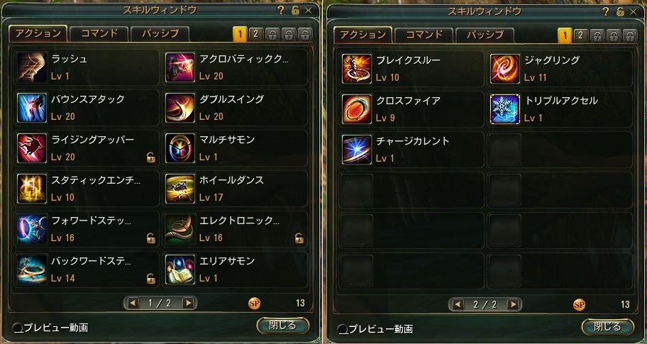 エルタのスキル狩りの振りを公開します。狩りのですよ。 大事なk( VPとかハイブリッドとかは必須スキルがなかったりするので恥ずかしいから見ないで・・・(そっち系はスロット2のほうにあります。パクリからのアレンジなので公開はしませんが) 狩りに関しちゃ正直振りたいのだけ振ったらちょうどいいくらいのSPなのでそんなに困ってる人はいないと思いますけど参考までに。 アクション コマンド パッシブ 説明がいるかなってとこを少し補足。 Q1 本は? 使ってるのは6セット。振り方に影響するとこでいうとフォワードP、クロスファイアPはあるものとします。ないのにM振りする人はいないスキルだと思うので。最低でも☆20と思ったほうがいいかな。でないとホイール打つ意味がないのでこんなに振らなくていい。 Q2 ○○(スキル名)要らなくね? はい。要らないと思ったらざっくり削っていいと思います。余ったので振ってみただけってのもたくさんありますので。アクロバティッククロス、バックワードステップ、スタティックエンチャント、クイックストライクあたりなんて使う場面はほぼないし。 Q3 ○○(スキル名)振らないの? はい(いいえ?)。振りません。狩りで使う成分だけ抽出して尾ひれ(Q2参照)つけてあるだけなので。見当たらないスキルは要らんと判断したと思ってください。 おまけ。立ち回りとかその辺。 メインはフォワード、ジャグリング、クロスファイア、ホイール。 あとのスキルはフォワードのCT回復用と割り切れば大体狩り中の姿が見えてくるかもしれません。 ホイール(☆20)とクロスファイア(☆29)はセット効果狙いもあるので積極的に打ちます。クロスファイアはフォワードより火力出るんでそれでなくても打ちますが。 その辺が全部CTの時にようやくメレースタンスが出てきます。プル→バウンス→アッパー→ショック利用でスタンスチェンジ(ショック本の有無で変わってくる)が大体ワンセットですかね。フォワードのCTそんなに長くないのでSSA破壊がどのくらいほしいかで都度いくつか削っていいと思います。上記4スキルだとバウンスとショックだけですねSSA破壊。 ちなみにCT減は、フォワード打ちきった後すぐにジャグリングとクロスファイアを待ちなしでぶつけたら丁度フォワードのCTが終わるくらいあれば十分です(速度次第かもしれませんが15%じゃ足りない)。 改善の余地についてはあると思いますが、必要性を感じないってくらいです。狩り効率が上がるほどではないですが1でもダメを増やさないと気が済まないならエリアサモンとかマルチサモンに振ればいいんじゃないかなと思います。 PR Comments
