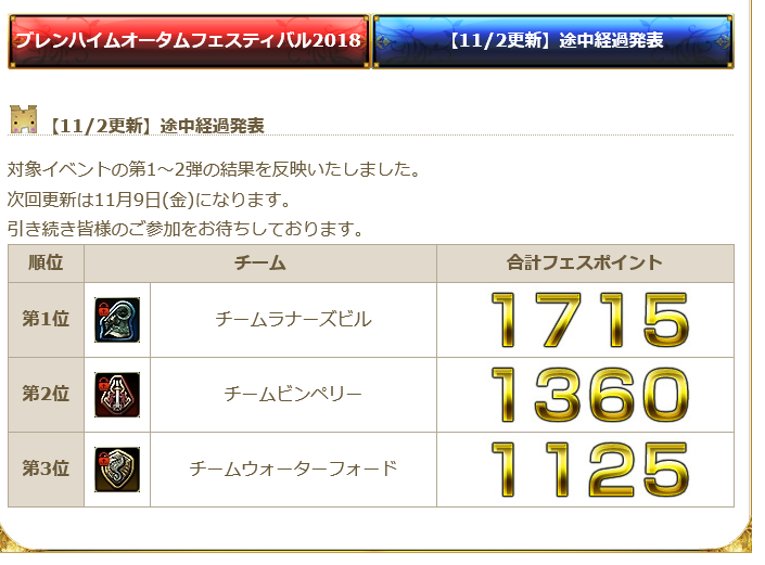 金曜日恒例の各チームの点数状況が公開されました。 恒例ってまだ一回目ですが、過去のイベントを踏まえて恒例ってことでひとつ。 我らがラナーズビルが一歩リードです。今回は無制限に点数が入るイベントが含まれていたので各イベントごとの点数の割り振りはわかりませんね。 次週も珍しく戦力が直結してくるイベントがはいってるので、このままの順位で推移しそうな気がします。俺もはじめの予定よりはシャドウ混沌に行けてるのでぼちぼち貢献できるようにがんばります。 水村に関しては街で見かける守護つけてる人の数自体少ないような気がしますもんね。 2CHに関してだけ言えば圧倒的にラナが多かった。チーム守護以上の守護持ってる人はつけないのでそれだけが全てではないですけどね。 PR Comments