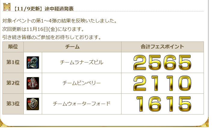 金曜恒例~ってことで2回目の途中経過更新がありました。 画像は別PCに保存されてるので貼り付けるのは省略します。ま、公式から見れますからね。 点数だけ書き出すと、順位は変わらず。 ラナーズビル:2565(+850) ビンペリー:2110(+750) ウォーターフォード:1615(+490) 水村は終わったな・・・ビンペリーはまだ逆転の目がありそう。 俺はラナなので逃げ切るために少しでもチームに貢献したいところです。 今週はトリッキーな、集めた数が多いほうがチームボーナスポイントが少ないイベントが混ざってるのでちょっと気になるところですが、前の記事で書いたとおりそれでチーム全体の個人ポイントの順位が低くなると結局まくられるので100点位のチームポイントの差はあんまり気にせず個人点でガッツリ稼いだほうが良さそうな気がします。上位枠数人で覆るくらいの差ですからね。 これで折り返し。どうなるかなぁ。 とはいえ総合成績でもらえるアイテム別にそんなほしいのないんすけどね。 11/12追記 ようやく操作担当のPCから持ってきました。 PR Comments