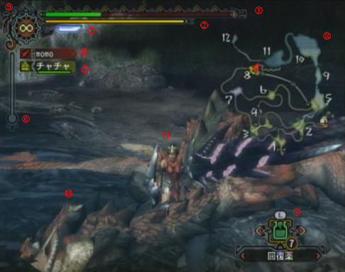 どこで何を間違えたのか自分でもよくわかりませんが、 新しいノートパソコンを買っちゃいましたwww dynabookですが、何か? リカバリーディスクの作成がセルフサービスですが、何か? ってわけで、リカバリーディスクが出来るまでは怖くて初期化もできないので、 MH3のSSを使って画面の見方を簡単すぎるくらい簡単に説明します。 (要するに暇。) 画像に番号振りました。1番から順にいきます。 ①体力ゲージ 緑部分が現在の体力、最大値は150(画像は100)。緑部分が無くなると1死。 アイテム「回復薬」等で回復可能。参加クエストの条件にもよるが、大抵の場合は3回死んだらクエスト失敗。 ②スタミナゲージ 黄色部分が現在のスタミナ。ダッシュしたり前転したりガードすると減る。 基本的に時間経過で上限が25刻みで減る(最小25、スキルで減少を防ぐことは可能)。最大値は150。 アイテム「こんがり肉」等で回復可能。 ③斬れ味ゲージ 武器の切れ味の状態を表示。モンスターを攻撃したり、ガード行動を取ると減少していく。 ゲージの状態で攻撃力に補正がかかる。ゲージの長さ/割合は武器によって様々。 アイテム「砥石」使用でゲージの回復可能。 【補正大】紫→白→青→緑→光らない→刃こぼれ→刃こぼれ+赤【補正小】 ④自キャラの名前 特筆事項なし。 ⑤クエスト同行者の名前 画像ではオフラインモードなのでNPCが同行。オンラインモードなら自キャラ含め最大4人までクエスト参加可能。 ⑥酸素ゲージ triからの新要素「水中」での酸素量を表すゲージ。なくなってもどうなるかは知らん(なくなったことがない)。 アイテム「酸素玉」でや、MAPにある酸素補給ポイントで回復可能。 ⑦アイテム 現在選択中のアイテム。 ⑧地図 支給品の地図か「地図常備」スキル発動で表示。どちらもない場合は、自キャラがいる周辺のみ表示される。 ⑨時計 白針が現在の時間、赤針が制限時間。triでは現実の時間とゲーム内時間で差があるらしい。 ⑩自キャラ 自分で操作するキャラ。視点切り替えの中心点。 ⑪大型モンスター いわゆるボス。クエストクリアの為に、討伐・捕獲する場合が殆ど。 Wii2万円になるらしいし、モンハン買ったらいいよ! PR Comments