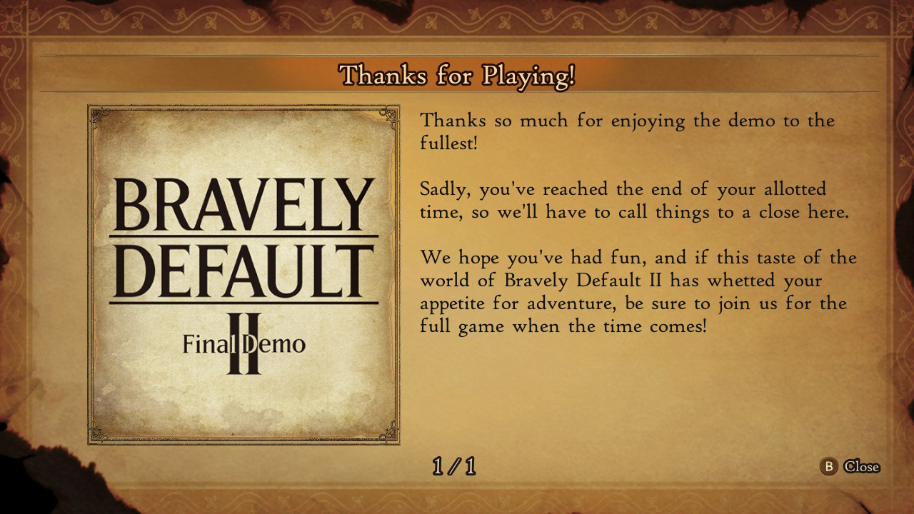 まずは終了時の画面から。 ありがとうと時間が来たからここまでだよ的なこと、それから製品版(フル版)が出たらそっちでもよろしくね的なことが書いてある。 去年のファイナルじゃないデモ版だと、 ありがとうってところは変わらないけど、よくぞここまでたどり着いた的なコメントがあって熱かったけど、さすがに実製品の体験版だとそういうの差し込むのも違うよねってことでこれはこれであり。 プレイできた範囲だと、Anihalがすごく好みのキャラ。プレイアブルじゃないと思うけど。主人公メンバーの中だとAdelleかな。Sethも好きだけど、主人公キャラってティズのイメージが強すぎて。よくよく考えてみたらBDでもAdelleポジションのキャラ好きだったな。そういう性癖なのだろうきっと。 この幸の薄さに幸あれ。 あとは製品版で楽しもう。 PR Comments