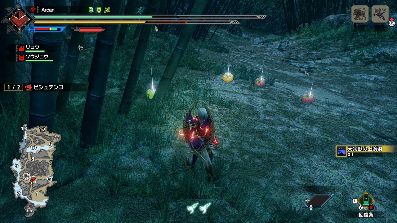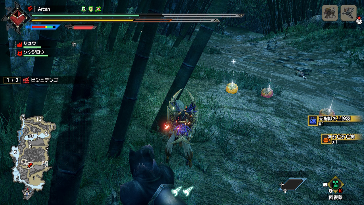 上位の柿が全然でねぇんじゃ、という時期を経て出た時のSSが発掘されたので紹介。 マジでビシュテンゴの柿が一番苦労した気がする。シビシビ柿ってやつ。 ちなみにその変に落とし物の柿ばらまくときにたまに落ちる感じ。 ピカピカもあんま出ないけど同じような感じで落ちる。 アイテムはオレンジ色のアイコンだけど、地面に落ちた柿の色は緑。 この左側のやつがシビシビ。 取得ログ。 参考までに、上位ビシュテンゴの討伐数は↑のやつ終わった時点で30体(捕獲4)。 これ2体出るクエストで、それまでドロップ0だったから29体目で初ドロップ。その時のSSが上のやつ。3%くらいのドロップの奴と同じくらいと考えたらいいかなぁ。 実際には飽きるから2体出るとこと1体出るとこ、ほかの大型のクエみたいな感じでローテーションしてた。もうビシュテンゴはおなかいっぱい。 PR Comments