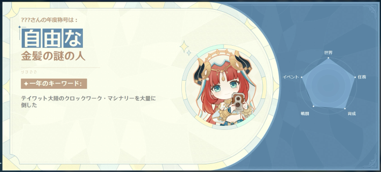 なんか帰ってきたら周年イベントでこの1年の思い出的なサムシングが見れたから一通りSS撮ってみた。全体的な感想として、去年より全体の話が多かったかな。去年はより具体的な、ピンポイントなとこの評価項目が多めだった気がする。 最初のひと塊。そんなに特筆することはないかな。 お金がえぐい。獲得はともかく思ったより消費してんなって印象。武器強化もそんなしてないしどこでこんなに使ったんだろ。遺物強化が一番怪しいけどこんな額行くかね。強化して気に入らなかったら溶かしてるから物として残ってないと意識しづらい。 最後の一枚とか、その他の人間勢力を一番多く倒した日ですとか言われても・・・多分ファデュイだろうけど、しらんがな。 ここはマジでどうでもいいかな。伝説任務はリネの奴出すだけ出してやってないから宵宮が最後になってるね。完了済みが一個少ないのはそういうこと。 これも特にいうことないかな。フォンテーヌ以外は一応MAX。 カードと洞天関係。大きくないサイズに更に淡い橙に白って色合いの関係で見づらいけど許して。 戦闘関係。多分それなりにいい評価だと思うんだけど最後の結果で戦闘関係だけなんかマイナス食らってる。螺旋は9~12には、入院してた数回を除いて参加した回はほとんど全部12層☆最大まで行ってると思うんだけどこの評価ってことは、1~8の挑戦が0だから一回も行ってないって判定にされてる?だとしたらなんでや! ほんで総合。一応最後だけサムネ表示で大きく見えるようにしとく。 見ての通り戦闘だけ目に見えてへこんでる。螺旋以外の評価は悪くないはずだからきっと螺旋が足引っ張ってる。あとはお金の方の花が0回ってのも足引っ張ってんのかな。 PR Comments