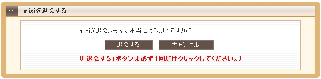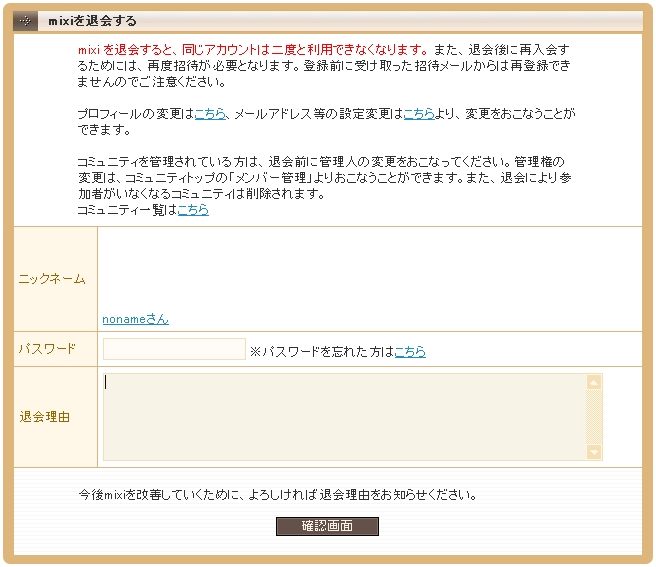 長らくお世話になっていたところから抜け出しました。 理由はないってことにしておきますw 地雷フラグだと思ったあなた。 勘繰る方向間違ってますw出直してくださいwww 何から抜け出したか。 みくすぃーです(検索が怖くて普通に書けないなんてそんなことは!!ない・・・とおも・・・う・・ぐふ。。 滅多にやろうとする人居ないだろうから流れでも書きますかw まず「ヘルプ」→Q&Aから「退会するには」を選びます。 そのまま進んでいくと こんな画面になります。(名前はアカウント消すために変えましたw パスワード打って適当に退会理由あるなら書いて 確認押すと、 こんなんになって、ボタン一つで退会になります。 左にあるボタン押したら、しばらく処理してるような間があってから トップページ(ログインするための画面)に自動で飛ばされてアカウントは見事消失。 となりますw いい経験って奴ですかね~ あるマイミクの人の日記は見ていたかったけど… 僕はダメ人間だから、 見たら、見れる環境に居たら、いけないんだよん 遠くから応援していきますw もう見ることは出来ないけれどもねw まま、こんなしょーもないこと言えるわけないんで?w 一人を除いて誰にも言わずにアカウント消しましたw マタ誰かが誘ってくれるまで、さよならmixiさん。 今までありがとう。 PR |