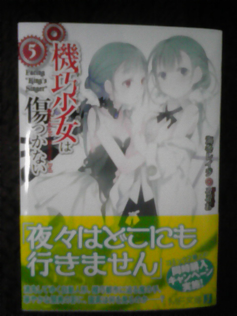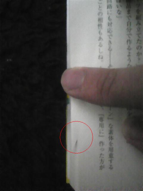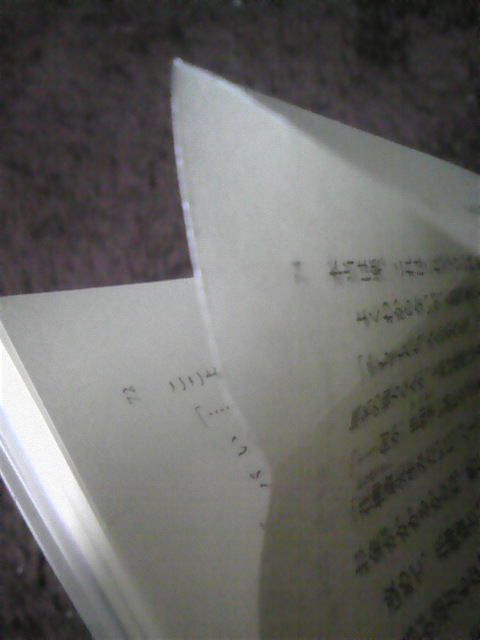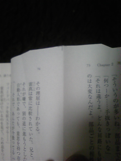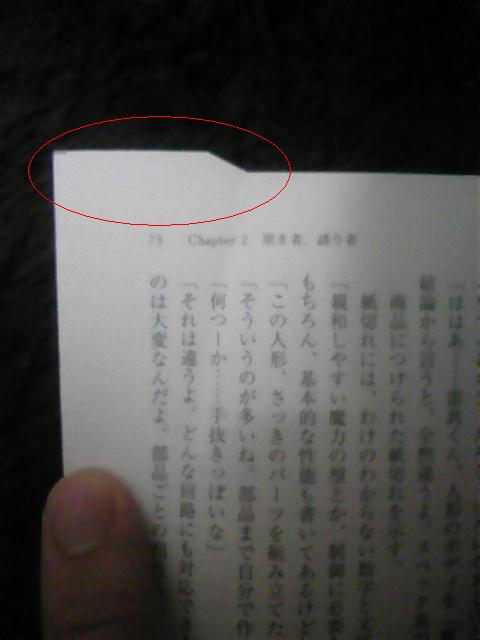 レア物ゲットした。松明です。 先日購入した小説(俗に言うラノベ)を読もうと思ってみたらあら不思議。乱丁でした。という話。 ブログのトップに写真貼りたくないから続きは全部続きに投げるよー。 続き開くのメンドクセーって人用に要約すると、 ・MF文庫Jから3月25日発売の「機巧少女は傷つかない5」をろくに確認もせず購入 ・いざ読もうと思ったら凄まじい乱丁で袋とじみたいになってるところが ・普通と違うもの(穴の開いてない50円玉とか)大好きな俺歓喜 ・製造工程も見えてくるレベルの乱丁なので迷ったけど記事に ってとこです。正直俺みたいに乱丁引き当てて喜ぶのはあんまりいないと思うので誰得?俺得って感じです。 一旦ここまでで投稿します。RSS登録しちゃってるレアなアレな人はたくさん飛んじゃったと思いますが気にしないでください。 続き というわけで実物(表紙&帯)がこちら るろおさんが活き活きしt( まぁそれはいいです。もちろん何の変哲(ヘンテツってこんな字なんだ)もないただのマシンドール5巻です。 俺は読むときカバーをはずして読むんです。これについては大まかに3通りの人がいるでしょうがどれでもいいと思うので気にしたら負けです。で、カバーをはずして間に挟まってる奴をBOXに入れたところで違和感がありました。 なんか折れ曲がってる?!って思って開いてみたらただの折れ目ではなかったね・・・ ぱっと見ただ折り目がついてるだけかと思って直してスルーしようとしたら、図形好きな人はこの時点で違和感があるでしょうね。この折れ方では元の本の形にならない・・・ そうこれを戻すと以下のようになります。 はい見事にはみ出してますね。マシンドール5巻持ってる人は73~76頁辺りを見てもらえれば対応がつくと思います。そのまま比べてもらえれば他が下がってるんじゃないことが分かると思います。要するに俺が加工したんじゃないよって。まぁ所詮写真だからいくらでもわからないように見せる事は可能ですが。 ちなみに文庫(ほか)ってのは、背を綴じた後に読みやすいように裁断の過程が入るんですが、その段階で折れちゃったってのが乱丁の発生原因です。落丁は綴じる前に抜けたパターン。 なんですが、続きの手前に書いた製造工程が見えるレベルってのはここで、綴じる段階でどういう風に紙を配置してるかってのが通常なら裁断されて見えないはずの領域が乱丁のせいで残ってしまってて分かっちゃうんですね。これは製本所とか印刷所毎に違うと思うので全ての文庫がこのやり方ってわけではありませんが、この場合、本文が両面印刷された紙を二つ折りにして2枚になったほうが背表紙側に来る用に綴じてるようですね。それじゃ全ページ袋とじじゃねーかってなるので裁断の行程でその部分も含めて落としてあります。 言葉じゃきっと伝わらないでしょうね。俺と同じくらい予備知識があれば(大してないけどそれくらいでもあれば)折れて裁断されそこなったで十二分に分かりますが。と言うことで結局どうなってるかってのが以下。 これが本来切れてるはずの部分ですね。右が73ページ。左が76ページ。裏にそれぞれ74と75がありますが、袋とじみたいになってて見せられないよってなってます。下みたいに。 ページ数見えるかな。一番左が72ページ(だったかな)。綴じちゃってる∧形の左部分が74、見えないけど右側が75ですね。接写で取ったけど部屋が暗かったのとケータイの性能が悪かったので勘弁してください。読める人はお手元のマシンドール5巻(持ってること前提)とくらべて、あぁここかって照合してください。 ちなみに全部自宅のカーペットの上で撮ってるんですが・・・ケータイが地震速報も入らないくらい古い&部屋が暗くて無理に補正(勝手にやりやがった)された結果茶色いはずのカーペットが変な色に・・・つ、つまりあれですあれ。色は本来と異なる恐れがあります。 どうでもいいわ・・・ 後荒んだ心を反映したみすぼらしい指が写ってますがいや写ってませんね何も。 と言うわけで本日早速マシンドール5巻買い足しました。乱丁引き当てちゃった人の行動も2,3通りあるとは思いますが、俺は先に書いたとおり通常と異なるもの大好きなのでそのまま保管します。普通に読めるレベルの乱丁ならそのまま読みますが今回は2ページとはいえ綴じられちゃってるので新しく買い足したと言う形になりました。 一般人の行動としては、本屋に持って行って交換(多分大丈夫)、あたりかな。もちろん出版に送っても交換してくれるでしょう。このあたりの二つがノーマルかな。 俺には出来ないけど、もう一つの道として開けば普通に見えるなら切っちゃう人もいるでしょうね。うなさんはどうやらこのタイプのようで。金がない人、今すぐ読みたい人なんかはこれに当たるんでしょうね。 そんなこんなでマシンドールが既に7冊あるぞどういうことだ・・・ 1巻~4巻、4巻特装版、5巻乱丁版、5巻 こういうことだ・・・ まぁいうても富士見ミス