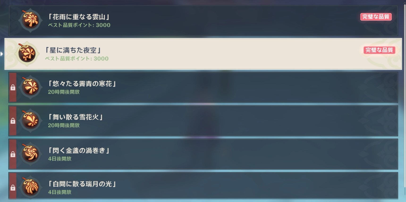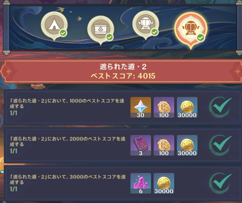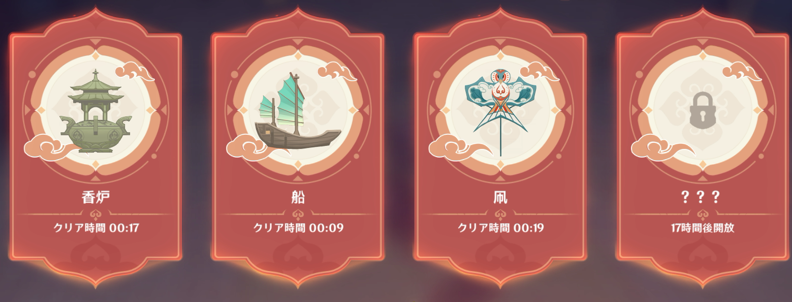 ちょっとほかにもいろいろやろうと思ってたことがあるけど出遅れたらどうなるか読めなかったからイベント華々しき流年を一気に進めた。他そっちのけでね。 二つ目の奴はほか二つと比べて大きめ。 任務に従っていろいろやった分で半分、残りは自由にどうぞって感じでイベントとしてもう半分って感じ。 こういうタイムアタック的な何かも二つやることになったね。 楽しいのは楽しいけど操作がむずい。 三つめはミニゲームって感じ。二つ目もやろってのは言いっこなしで。 これ一応上下もある程度合わせないとゴールできないのがむずかった。45度くらいは傾いててもOKだけどさかさまだとダメみたいな感じ。これコントローラーだとどうなってるんだろ。マウスだから結構自由に回せたけど。 てな感じでそれぞれ明日くらいに追加で出てくるみたいだけど、本番は4日後って表示されてる奴かな。 結局どのくらい全体でコイン類手に入るかわからなんままで、☆4のキャラと凝光のギアはもらいたいからいまのとこほかの報酬は一つももらってない。 2022.01.28 Fri 01:28:00