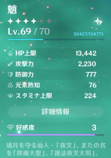 強行軍になったけど、なんとかメインシナリオは終わったっぽい。 雷電将軍の奴解決したら一応現行のシナリオには追いついたと思っていいんだよな。 しかし練習させられた雷電将軍のスキルへの対処だけど、全く必要なかったというか、結局練習は練習だった。本番では全く活かせなかったね。 ただ途中からはイベント戦闘で、戦闘不能になっても即時復活するしなんか元素系のチャージ早かったりCT空け早かったり?してたから強引な勝ちイベントだった感はある。それにしてもある程度は能力ないと元素スキル封じられるところまでも行けなかったりはするんだろうけど。将軍のスキル構成が絶妙だよね。殴り合うには結構隙見つけるのめんどくさいけど逃げ回るだけならいくらでもって感じの範囲。スキル封じられてからは逃げに徹してれば時間が解決してくれる。 それにしても前の記事で雷電将軍の情緒について触れたけど、その秘密も明かされて割とすっきり。初期のというか本質の方の雷電将軍のキャラ好きかもしれない。というか神様みんな好きなんよな。あとリーユエの仙人たちとか稲妻の仙狐も。 現状、戦闘からむ探索はディルック、ジン、魈、煙緋の風と火の共鳴目的パだけど、こういうボスのとこ乗り込むならやっぱりまだ、荒瀧、ジン、魈、バーバラになってるんよな。 うちの人員だと、魈は一人だけ抜けて強いから何やるにも外す選択肢がない。魈使いまくってるおかげでやりキャラ全般が使いやすく感じるようになった。現状こんな感じ。 SS撮るとき忘れてて火の共鳴込みだけど。レベルはどうせ次の突破できないから経験値無駄にしないように69でわざと止めてる。69まではアイテム使って一気に上げてるけどね。他のキャラはさておき魈でほとんどの敵を倒してるからなんかこの方が効率いいかなってね。 武器の突破も冒険者レベル40になったことだしそろそろやらないとだね。 そういえばようやく荒瀧くんも2回目の突破ができてレベルが50になった。あの素材の足なし狼くんが強くてねぇ。ただ凝光入れて挑んだらそんな苦労せずに行けたからたまに素材集めをしてもう1突破はしておきたいかな。 多少は戦闘についていけるようになったけど、それでも雷電将軍からは2000くらい食らってたから魈のほうが耐久あるくらいだったね。聖遺物もいろんなキャラのそろえる必要がありそうだ。 ちょっとほかのイベント類にも手を出してみようかな。この記事公開するころには終わってるけど、ポーションの奴とか、どうせハイスコアは狙えないけど最低限くらいは参加しておきたい。 この土日でストーリーはだいぶ進んだけど、進捗の記事はついこの前書いたばっかりだからもうちょっとまとう。ストーリー以外進んでないともいえるからね。 2022.01.17 Mon 01:17:00
